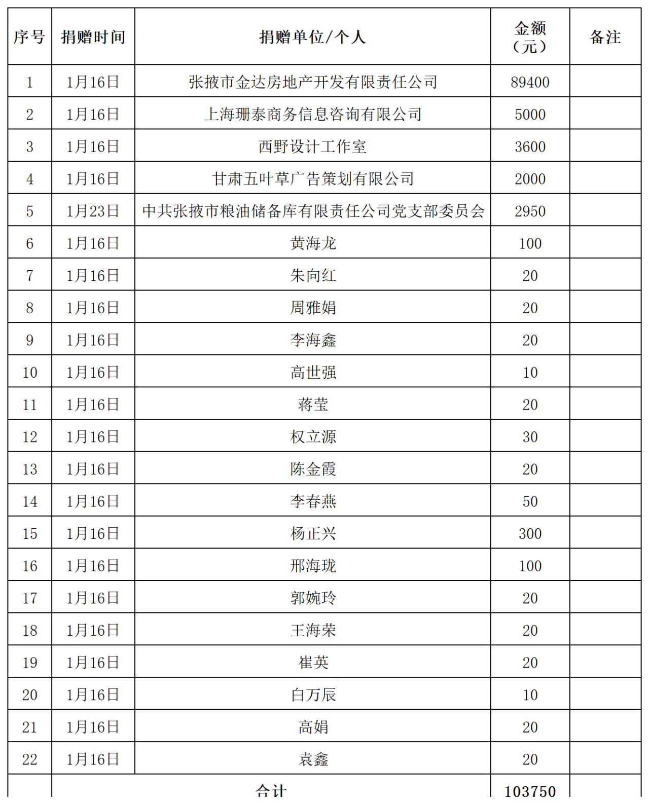 2025年1月7日,西藏日喀則市定日縣發(fā)生6.8級地震,張掖市慈善協(xié)會收到愛心單位、人士踴躍捐款捐物,幫助災(zāi)區(qū)人民抗震救災(zāi)和災(zāi)后重建。截至1月26日,接收捐款103750元,現(xiàn)公示如下: